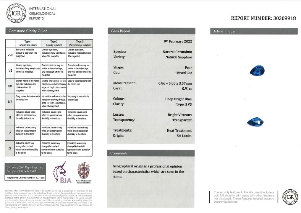 [SOLD] 6.86x5.00mm Pear Ceylon Sapphire Certificated (SAP101)