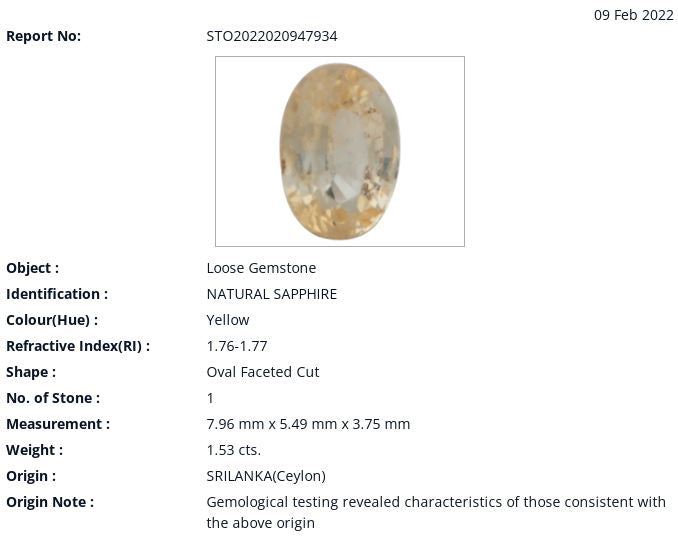 8x6mm Oval Yellow No Heat Sapphire Certificated 1.53ct (SAYV86T)
